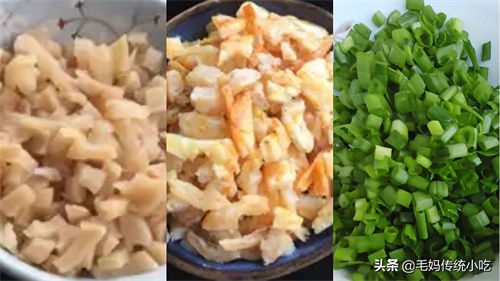 馅料炒制八成熟就可以,不用过熟,以免蒸好会影响口感糯米粉和粘米粉没有筋性,所以必须用刚煮开的开水烫粉,然后盖盖5分钟,让粉糊化,才容易揉成粉团不开裂。