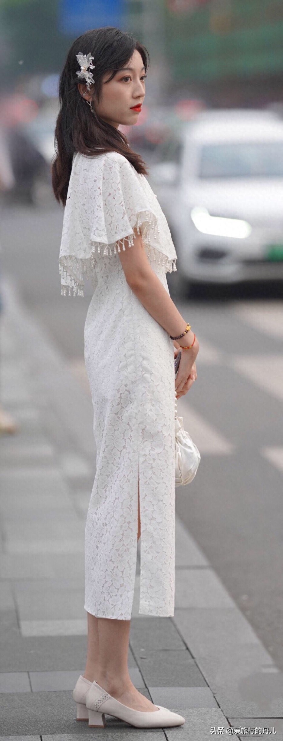 前两年随着《司藤》的热播,景甜在剧中身穿各式旗袍的华美复古造型圈粉不少,穿上旗袍的景甜时而性感妩媚如人间富贵花,时而又典雅曼妙梦幻如仙,这让很多小姐姐也都爱上了旗袍。就像图中的这位小姐姐,出门逛街就选择了一款白色的蕾丝旗袍,展现古典气质,尽显名媛风穿搭。这样的造型走在街头一定非常吸睛吧。