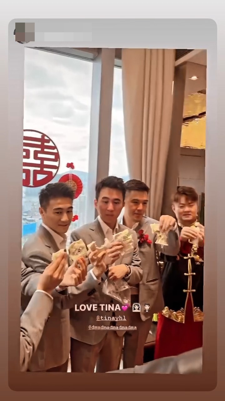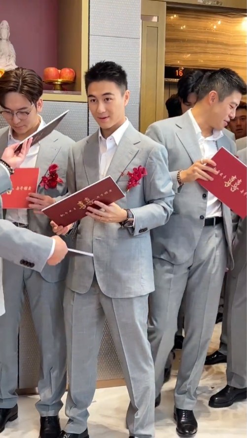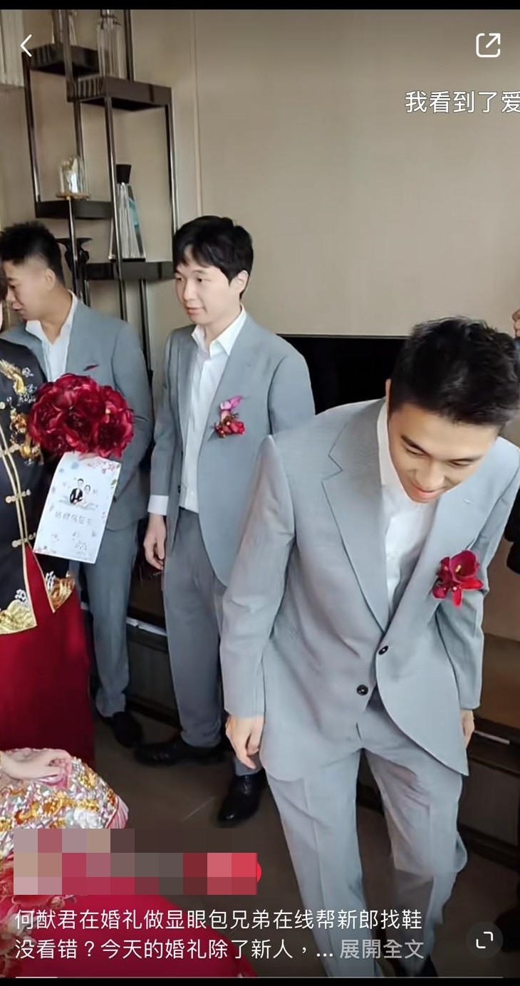 在接新娘时,何猷君全程任劳任怨奋力地完成姊妹团的的挑战,务求助好友聚得美人归,流出的视频中能看到何猷君忙到停不下来,甘做“现眼包”卖力帮新郎找婚鞋,新郎登上高处时,他小心翼翼身手扶着,细节处见教养,另外还见到何猷君跟何超欣开心跟现场来宾留影,有求必应。