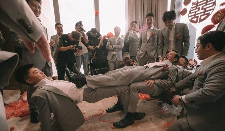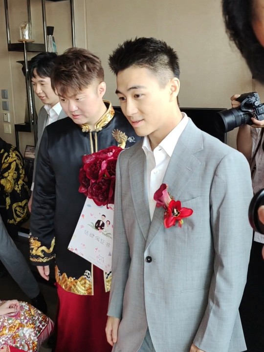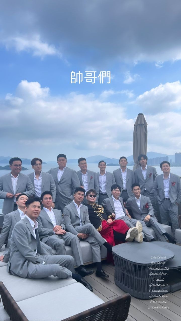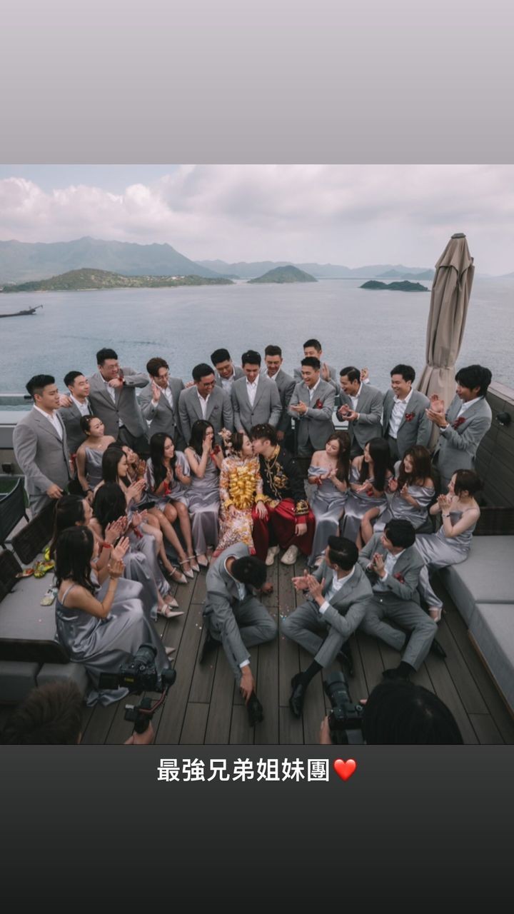 虽然何猷君已经贵为人夫,不过他依然多次为好友们的婚宴担任兄弟,今次还有王嘉尔的青梅竹马好兄弟权哥(Henry)一起助阵,何猷君妹妹何超欣与女星JW王灏儿亦穿上浅V低胸姊妹装担任姊妹。