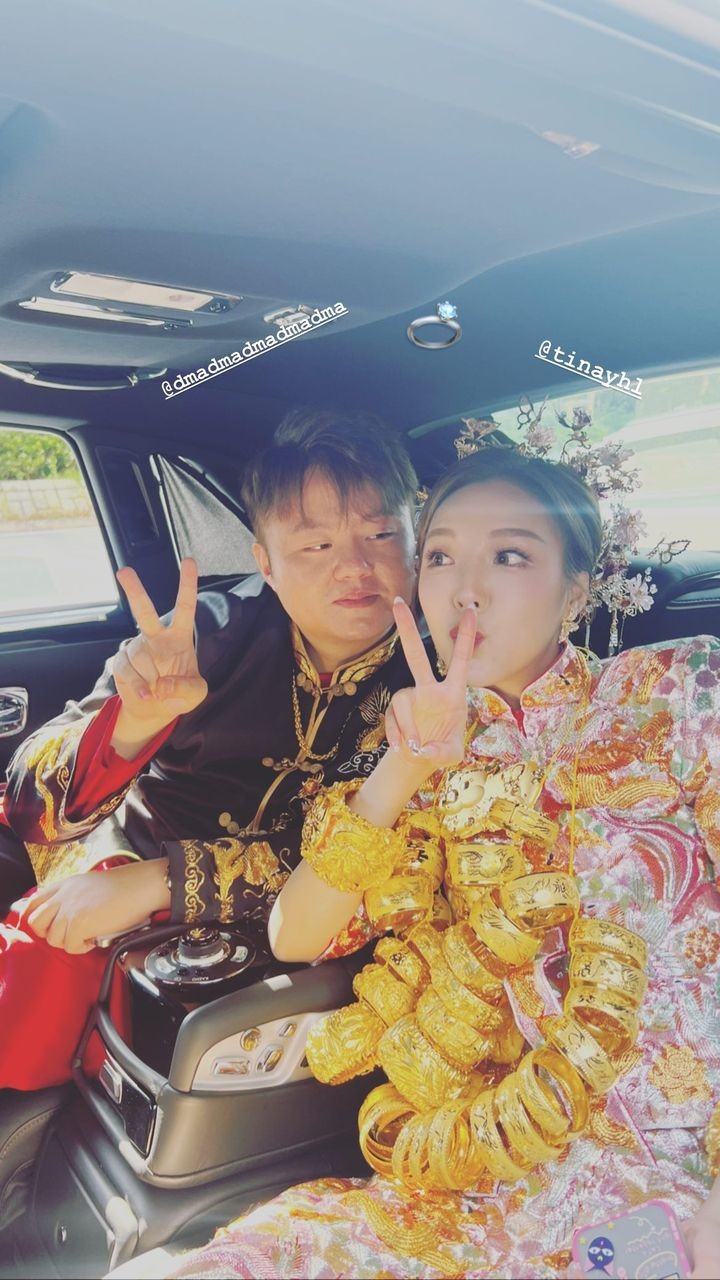 当天结婚的这对新人家境不凡,除了来宾中有不少名流,婚礼排场也十分豪华,视频中所见,新娘家豪宅装修精致,房间里有一个玻璃柜放满了hermès包,出门穿上贵气十足的褂后,颈上用红绳挂上超过20对龙凤鈪,几乎将上半身完全遮盖,堪比黄金甲,手上还戴有巨型流星槌,相当贵气!