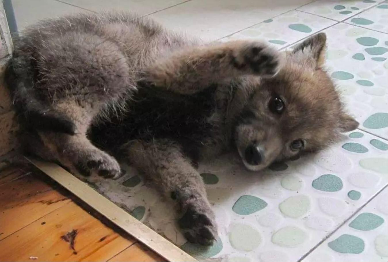 草原狼在遇到危险时会装死来保持体能,小狼崽到达牧民家中后靠着这招保持着所剩无几的体力。