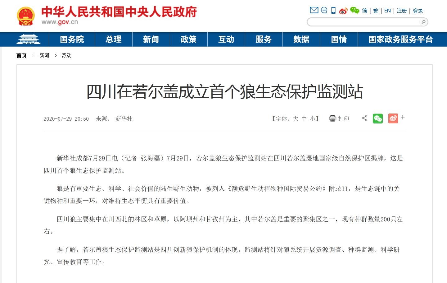 新华社——《四川在若尔盖成立首个狼生态保护监测站》
