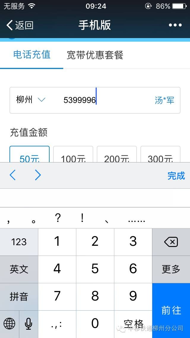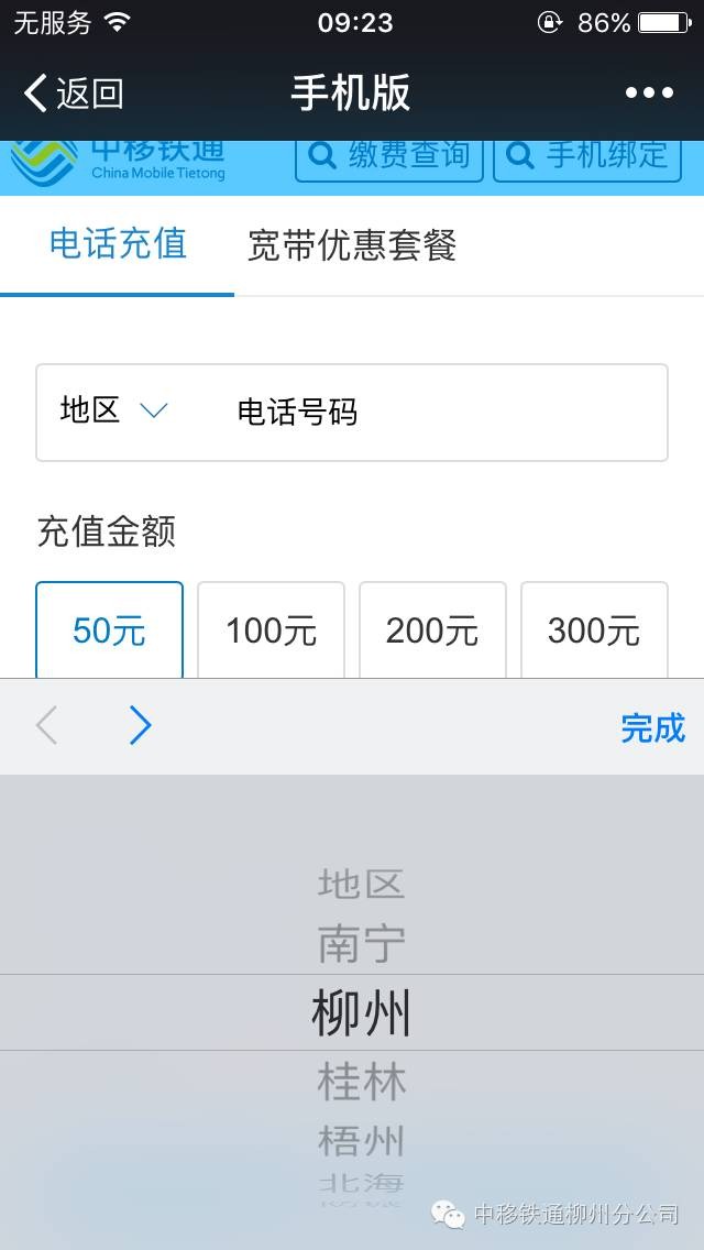 电话充值选择“地区”为(柳州),然后输入您的7位数电话号码,选择相应充值金额。
