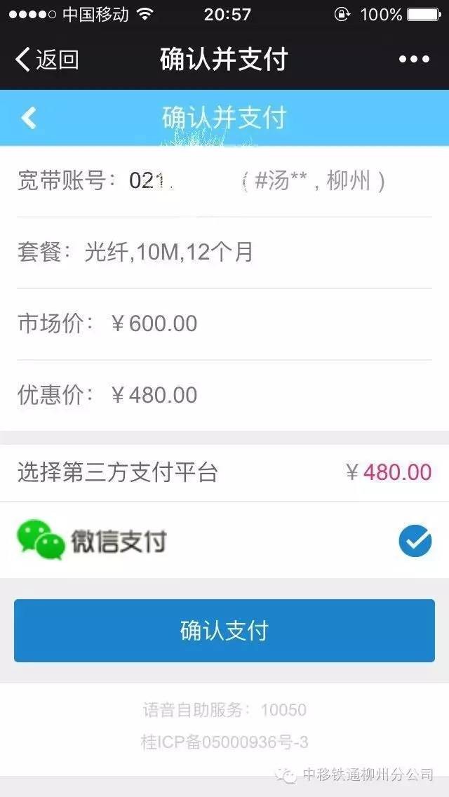 所有柳州铁通电话、宽带客户都可以通过“中移铁通柳州分公司”服务号微信支付缴费。