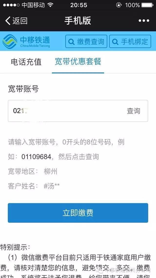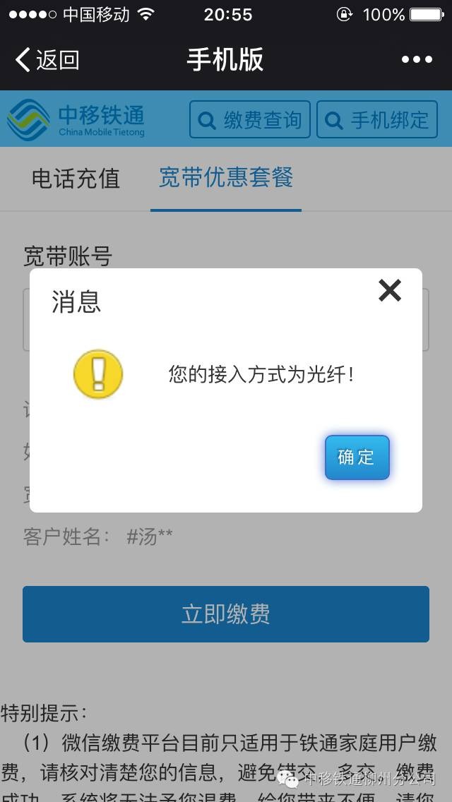 (1)微信缴费平台目前只适用于铁通家庭用户缴费,请核对清楚您的信息,避免错交,多交。缴费成功,系统将无法予您退费,给您带来不便,请您谅解!