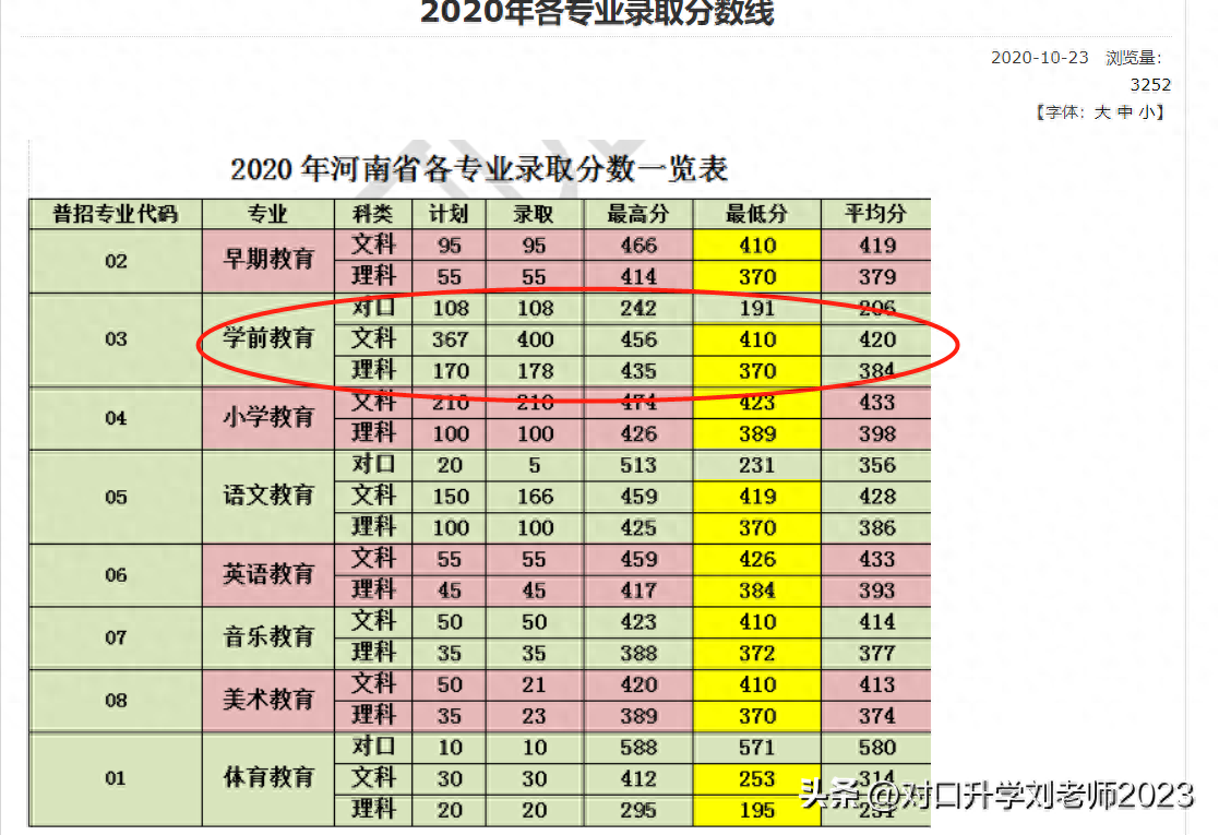 2020年安阳幼专对口学前教育专业录取分数线