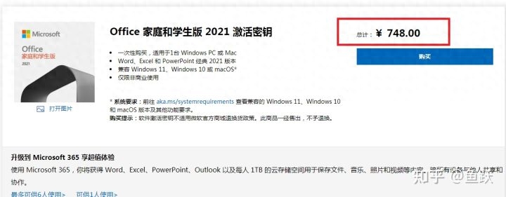 1.微软官方购买正版office2021家庭版要748元,比较贵,不划算。