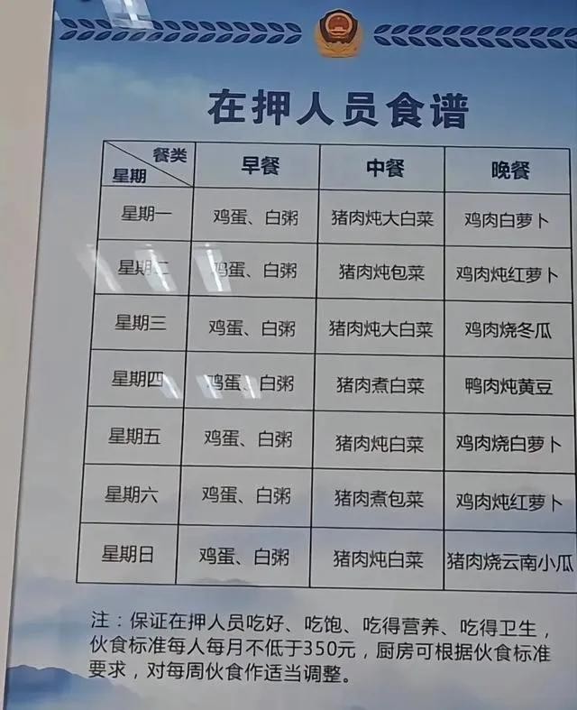 这在押人员吃的也不差啊,又有鸡蛋,又有鸡肉,猪肉,鸭肉,多少外面的人都达不到这标准,还吃的要营养,卫生,吃饱,吃好
