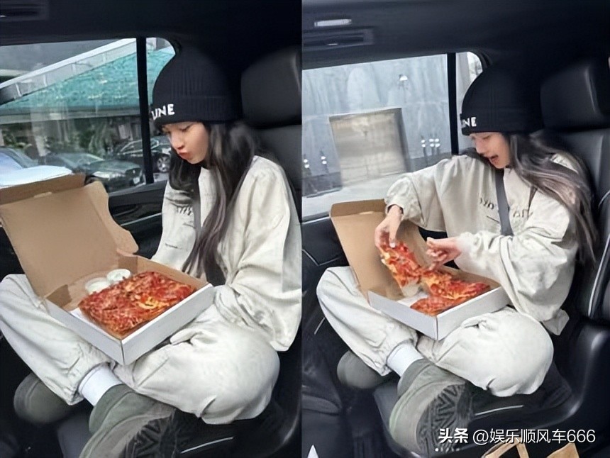 在公开的照片中,lisa把一盘披萨放在膝盖上,看到美食的lisa看上去很是高兴,直接上手准备开吃。