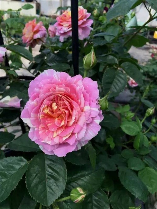 月季品种“彩蝶”粉黄相间的条纹,长势好,抗病强,开花不断
