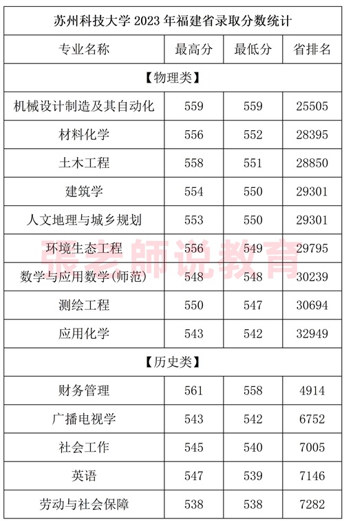 苏州科技大学2023年在福建省招生类型是普通类本科批,其中普通类物理组录取最高分559(省排名25505),录取最低分542(省排名32949);历史组录取最高分561(省排名4612),录取最低分538(省排名7282)。