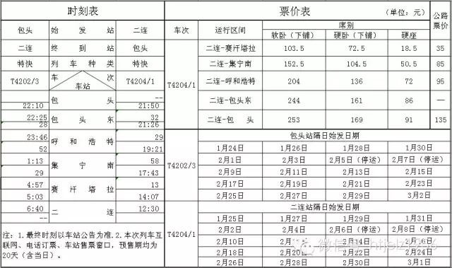 包头至二连浩特自1月24日起至2月5日止、2月9日起至3月2日止,隔日加开T4202/3次,全程运行时间为8小时30分。
