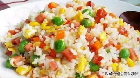白米饭一大碗,虾仁,胡萝卜,甜玉米粒,熟碗豆,火腿或腊肠,鸡蛋两个,葱花,盐,香油,玉米淀粉,植物油