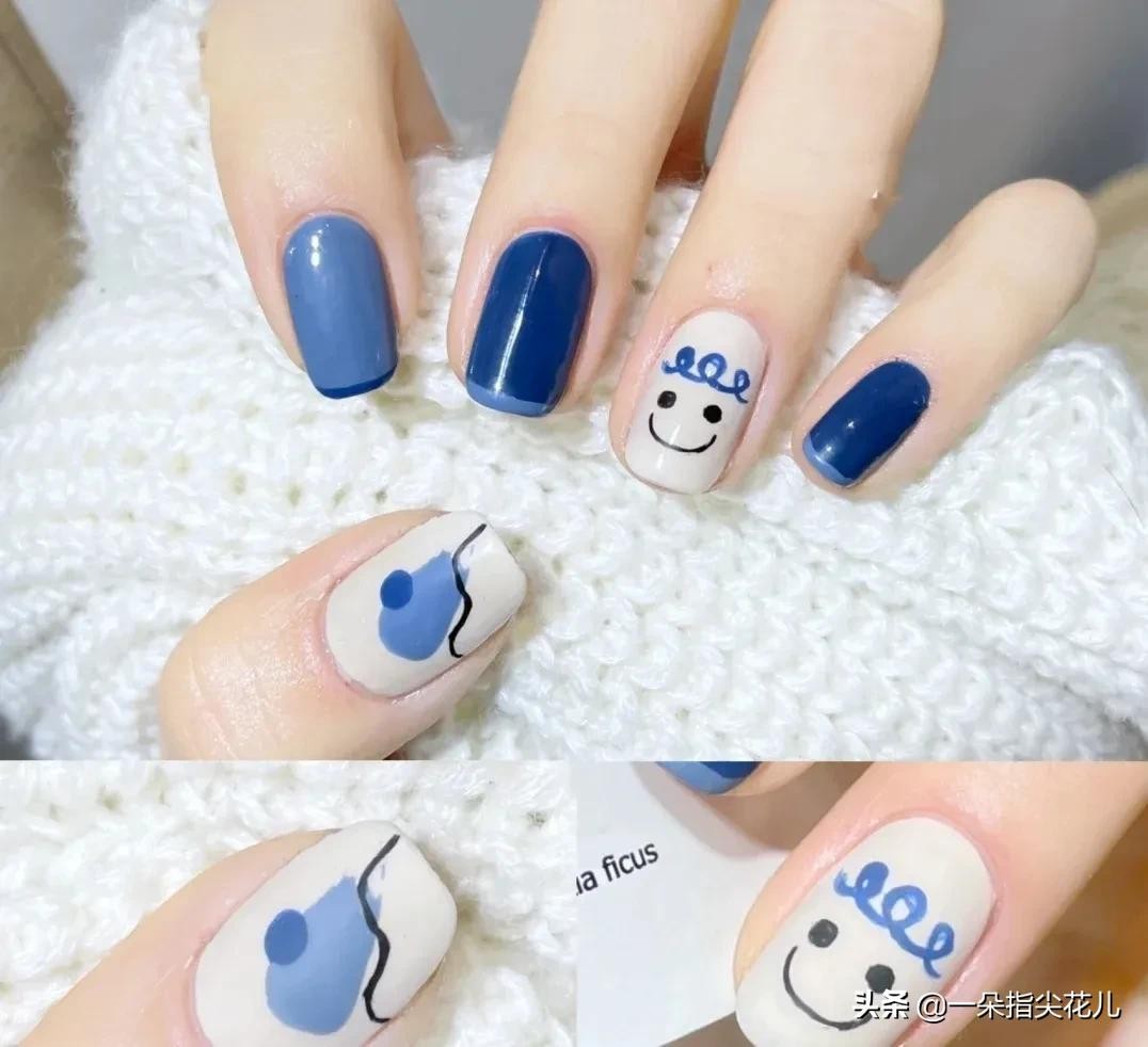 第二款:蓝色撞色双色法式,搭配童趣简单笑脸彩绘,颜色显白款式可爱。