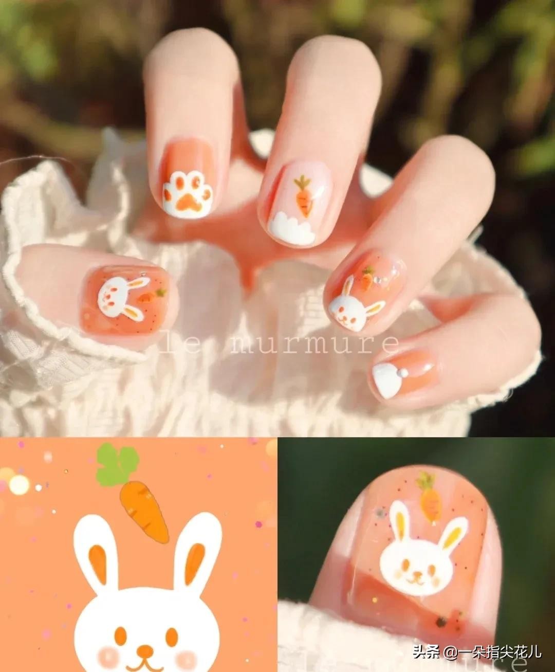第五款:橘色搭配可爱兔子彩绘,萝莉少女风美甲。
