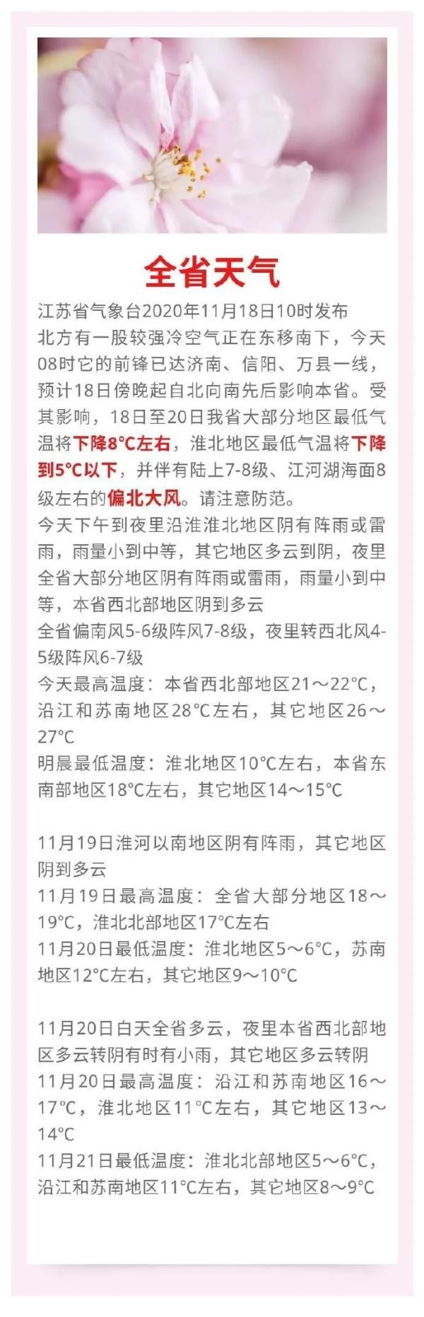 江苏省气象台也已经发布大风警报和降温报告。北方有一股较强冷空气正在东移南下,预计18日傍晚起自北向南先后影响全省。