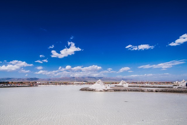 茶卡盐湖: 美丽的盐湖,湖水在阳光下呈现出五彩斑斓的景观。