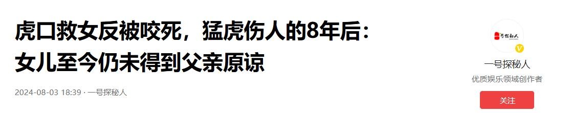 信源:2024-08-03 18:39·一号探秘人 《虎口救女反被咬死,猛虎伤人的8年后:女儿至今仍未得到父亲原谅》
