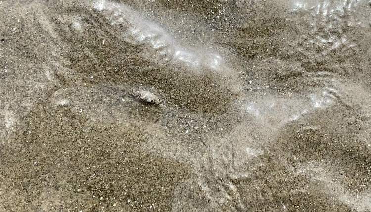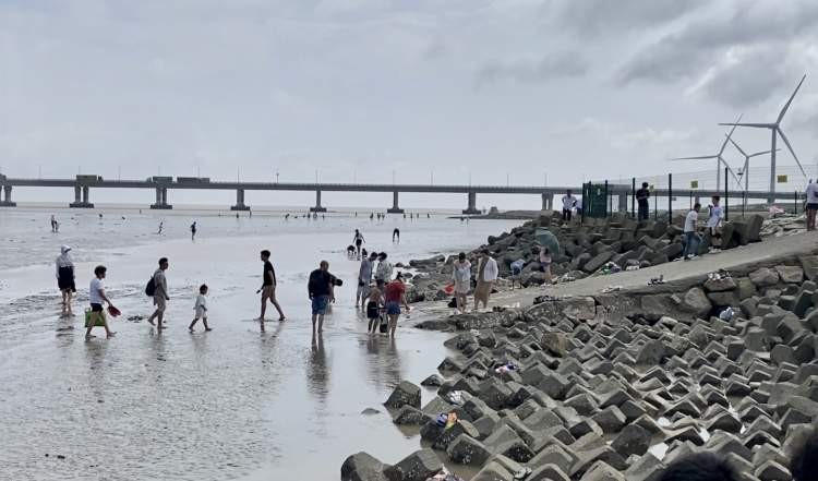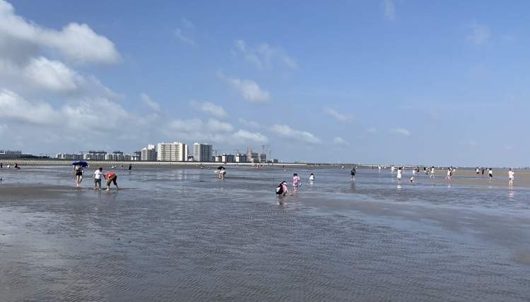 因为海水看上去并不清澈,因此真正下到海里的人并不多。人们大多是在海滩上散步,踩踩海水、吹吹海风、看看风景。倒是在海滩上赶海的大人和小孩有不少,拿着小铲子挖贝类、抓螃蟹、找小鱼,有些还真是收获颇丰。