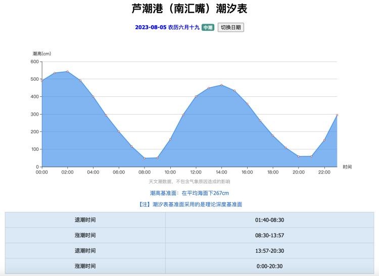 以8月5日(周六)为例:涨潮时间8:30开始至13:57分结束;退潮时间13:57开始至20:30结束;20:30以后又开始了新一轮的涨潮。干潮8:30和20:30就是当天水位最低的时候,满朝13:57就是当天水位最高的时候。