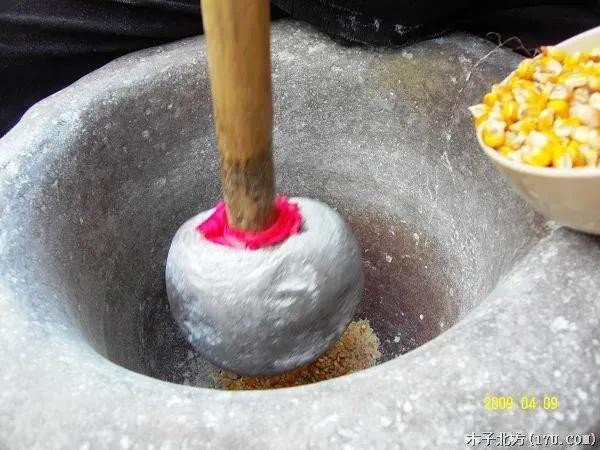 收豆子时总会有不熟的还是青色的豆杆,大人会把这些不熟的捆在一起,带回家放在太阳晒不到的地方,回到家,会让我们剥青豆,我们知道要做豆沫了,干的格外起劲,剥够一瓢就让停下来(剩下的下次吃,没有剥下来的,可以多放几天),然后去村子中央的石臼,用臼杵捣碎。去晚了是要排队的,收豆子的时候,做豆沫的多。还记得村中的石臼不到一米高,粗大概有六十公分,中间的坑印象中有40公分到半米,周围的石壁很光滑,一般用来给一些谷物去壳,或是捣碎东西。用石臼捣碎青豆后,回到家中用大火煮开,然后放入青菜(也可以用提前泡好的干菜),粉条,有时会放一点海带,放上盐,煮熟后用面糊勾芡(当时没有淀粉)。能闻到青香盈屋。