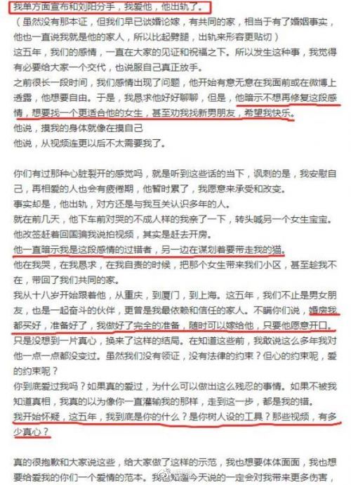 真的很抱歉和大家说这些,给大家做了这样的示范,我也想要体体面面,我也想要给爱我的你们一个爱情的范本。我也知道今天说的一定会对我带来更多伤害,毕竟这个社会对男性还是包容的多,但,你可以不爱了分手,请不要这样欺骗和利用。