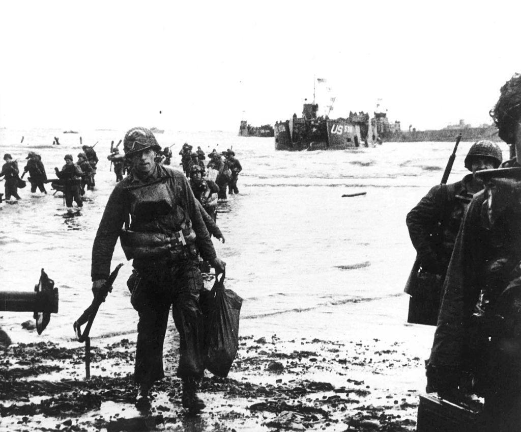 1944年6月6日上午,美国第1步兵师第16步兵团的士兵在奥马哈海滩涉水上岸