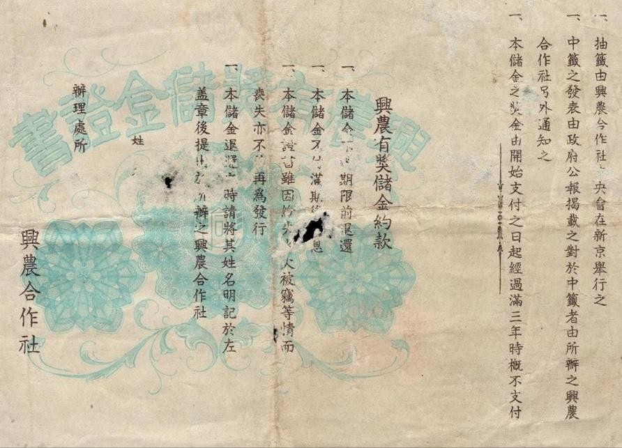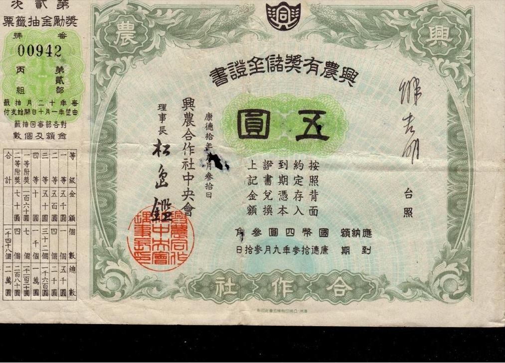 满洲国康德10年兴农合作社有奖储金证书伍元