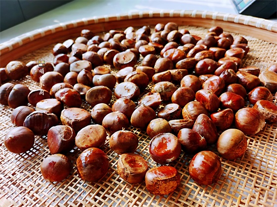 第一步:新鲜栗子摊放竹筛里放阴凉通风处晾2–3天,板栗稍微风干下,果仁收缩,包裹着的那层棕色外皮会自动与果仁脱离,晾晒过的栗子比新鲜的味道更甜。晾晒时不要放阳光下曝晒