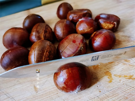 第三步:用刀在板栗鼓起的一面横向切一刀,板栗的外壳切开一口子,口子尽量长些,深度约5mm切透板栗外壳就好,横切开口好看,竖切栗子好固定更容易切入。用带齿的刀一推一拉就划开口子,用平时切菜刀的话要用刀尖不容易滑