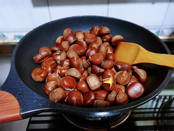第五步:干净炒锅不加油,倒入蒸好的栗子,小火不停地翻炒,大概炒10分钟,水汽炒干,栗子壳变深棕色,栗子的开口变大,露出黄灿灿的果仁便可关火