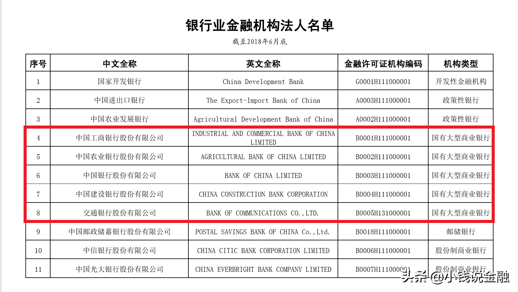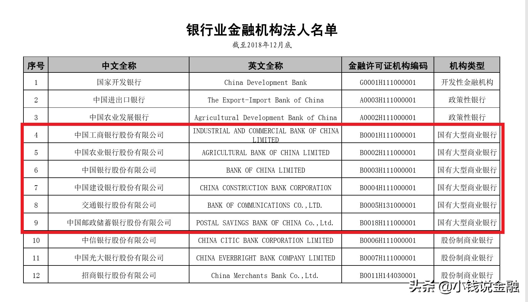 如下图所示,截至2018年12月底的《银行业金融机构法人名单》当中,邮储银行的机构类型变成了”国有大型商业银行”。此后,六大行的说法就流传开来了。