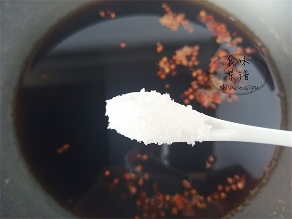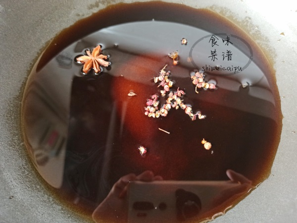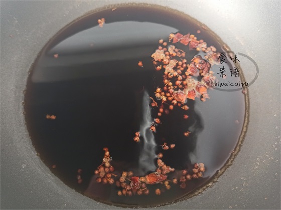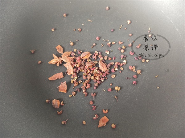 最重要的是调料汁,把锅烧热,下入花椒粒、八角,开小火翻炒出香味。