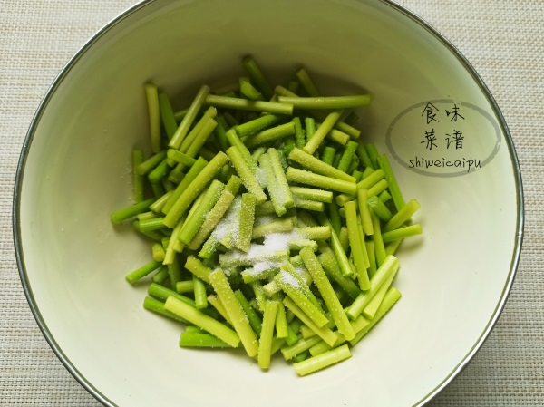 从超市或者菜市场,购买一把蒜薹,切掉头尾,洗净控干,然后切成长段,加入适量的食盐,翻拌均匀,腌制2个小时。