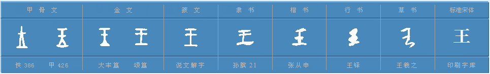 带领贵族或大家武力得取天下后封王。上面一横,应该是加冕的意思,也可能是奉天加冕的意思。另外,在远古时期,用小型战斧作战的称“兵”;在将帅身边使用大型战斧的高级警卫称“士”;手持特大战斧的将帅称“王”。开创缔枝为巢时代(巢居时代)的首领称“帝”;文治天下的智慧首领称“君” ;头戴金冠至上的王者称“皇”。