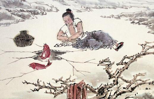 有一次后母患病,王祥侍候得非常周到,后母突然想尝尝鲜鱼的味道。可是当时正是隆冬时节,天寒地冻,路面结冰,河水也是冰冻三尺,哪里能找到鲜鱼的影子呢?