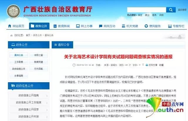 该通报中称,针对网络反映北海艺术设计学院考核试题出现不当内容的问题,广西壮族自治区教育厅高度重视,组成联合调查组,于1月21日下午进驻该校开展调查核实,现情况已初步查明。