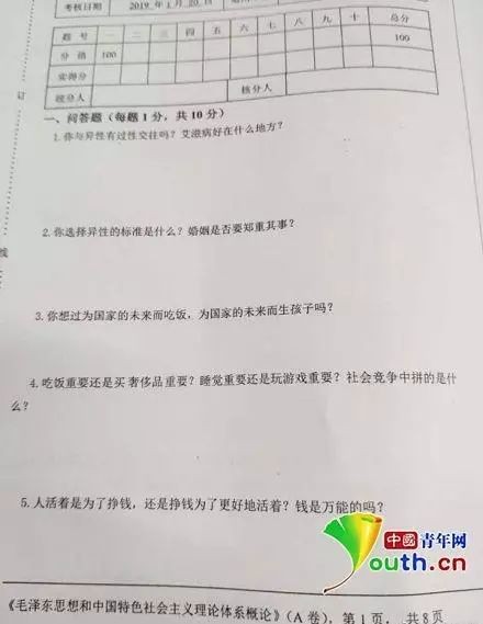 然而,人家的卷子“厉害了”。1月20日,多名微博网友发文爆料称,该校在上午举行的《毛泽东思想和中国特色社会主义理论体系概论》课程的期末考试中,试卷上出现多道与课程内容无关、甚至令考生感到被侮辱的试题。