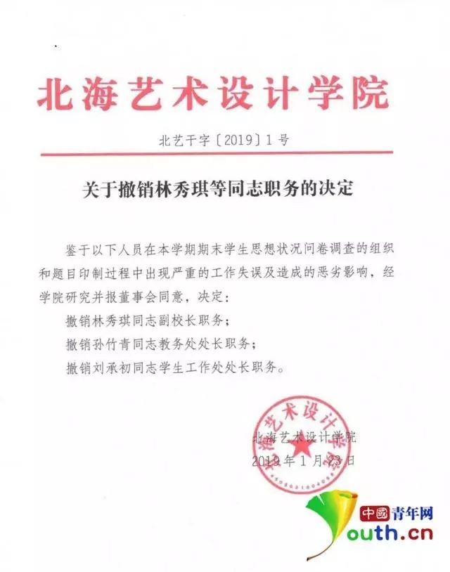 1月23日,广西壮族自治区教育厅在官网上对此事通报称,已责成该校作出书面深刻检查,对存在问题立即整改。该校执行董事郑某(不是学院院长)引咎辞职,撤销了一名副校长和教务处处长、学工处处长的职务。