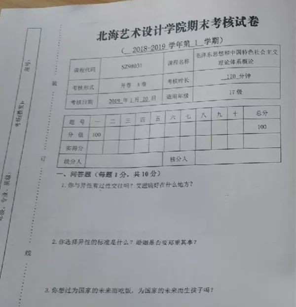北海艺术设计学院的考卷跟我们平时的考卷不一样。网友爆出来的两门课,一门是我们都很熟悉的毛概,另一门是《思想道德与法律基础》,按常理,都属于死记硬背,学生特别不想考的那种。