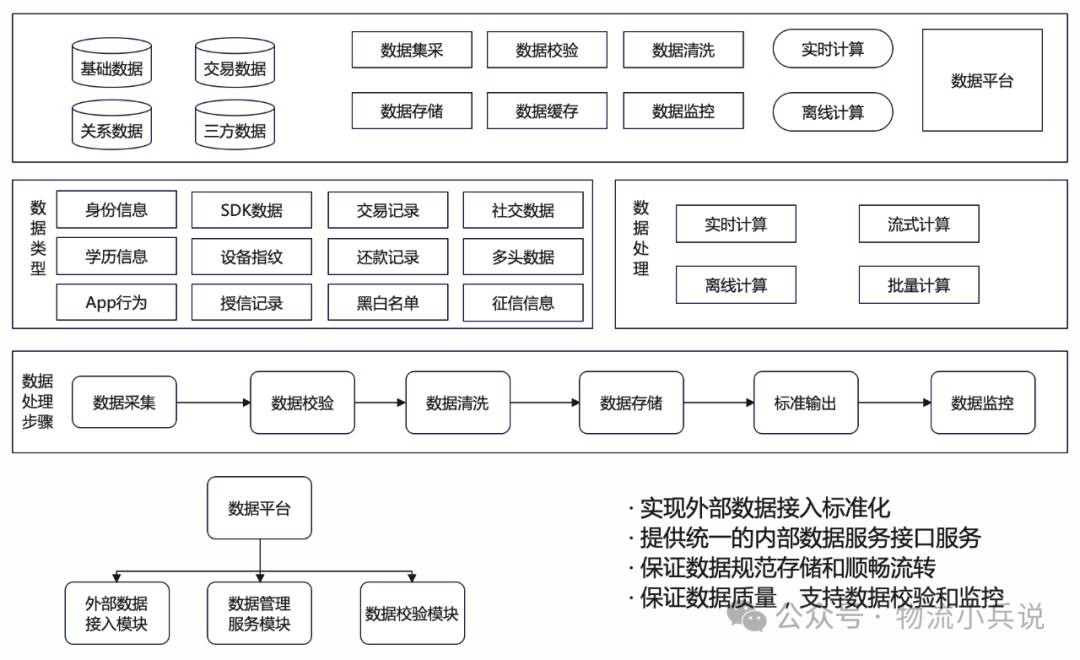 数据处理的步骤通常分为数据采集、数据校验、数据清洗、数据存储、标准输出和数据监控。数据平时数据层的支撑工具,通过数据平台来实现数据层的管理。通常数据平台包含内外部数据接入整合的功能,数据管理和服务的功能,数据校验和监控的功能,是智能聚合风控体系的底层数据仓库。