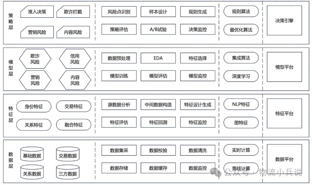 智能聚合风控系统包含四层架构,分别为数据层、特征层、模型层和决策层,横向划分包括关键内容、流程步骤、算法方法、工具平台等。