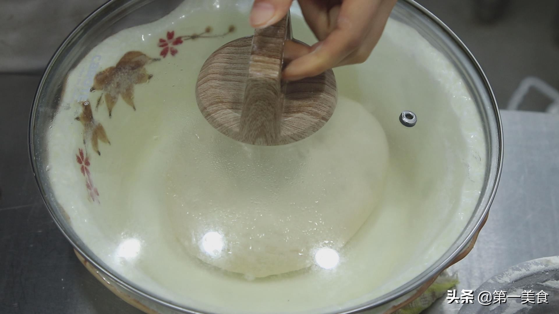一个小时以后,拿起锅盖看一下,面团已经快要溢出面盆了。