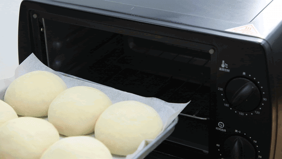 然后放在烤箱方盘中,这个时候先不要通电,把面坯再次发酵1个小时。