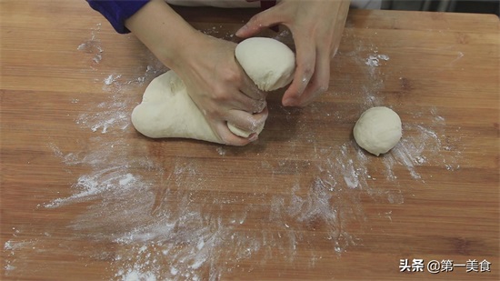 在案板上面继续揉搓面团,给面团排一下气。然后,把面团揪成六个大小相等的面剂子。