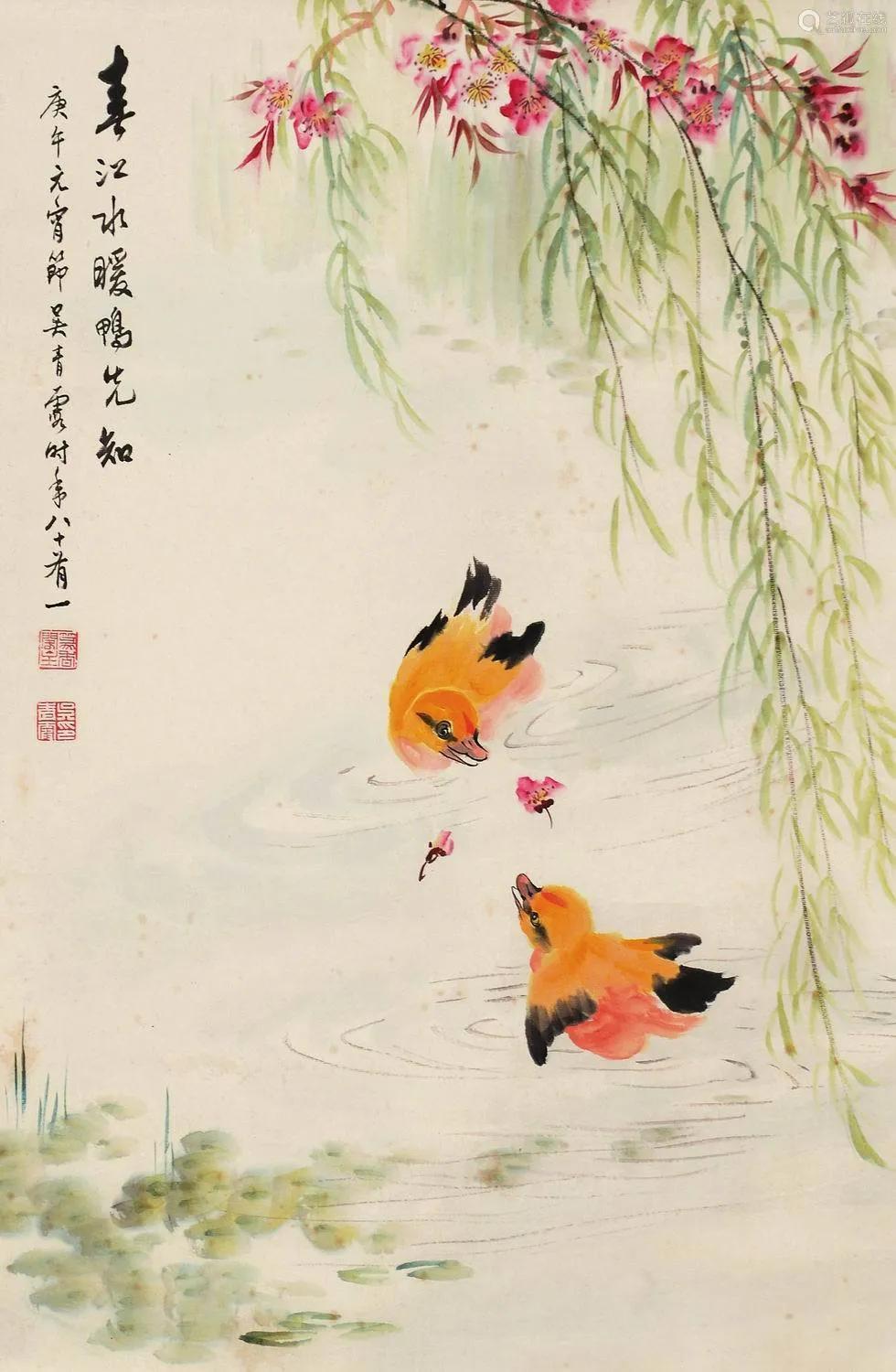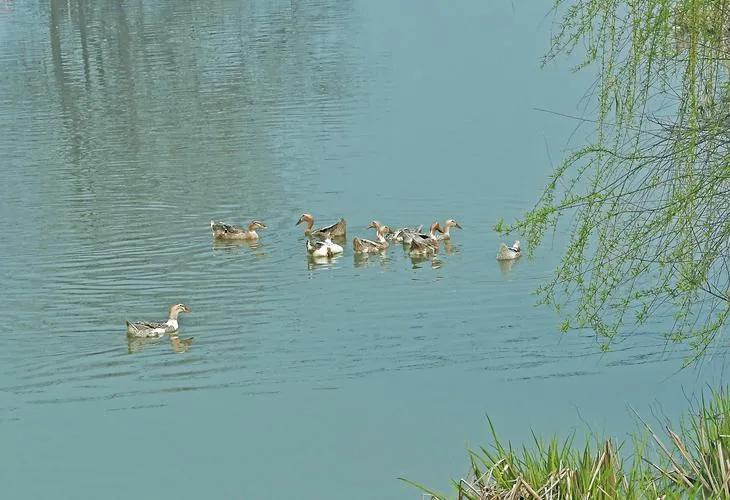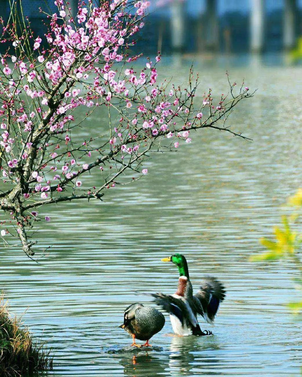 竹林外两三枝桃花初放,鸭子在水中游戏,它们最先察觉了初春江水的回暖。河滩上已经满是蒌蒿,芦笋也开始抽芽,而此时河豚正是上市的好时节,可以在市场上销售了。