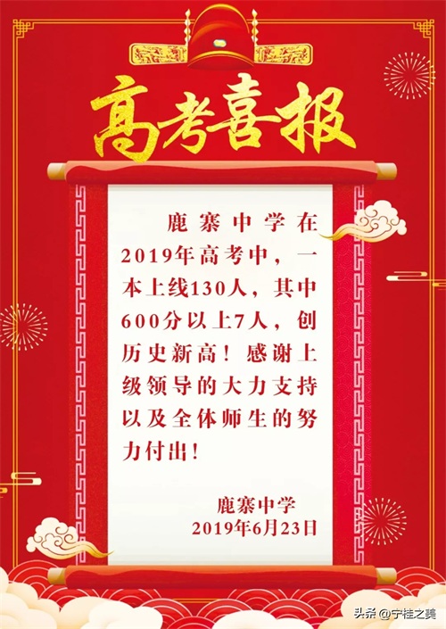 鹿寨中学每年参加高考人数,大约为1000人左右,一本率平均值大于0.7。网上多项资料显示,鹿寨中学2019年一本率72.96%,一本上线130人,600分以上7人。2020年一本率71%,一本上线176人,2022年一本率75%。2023年,有3名考生被清北录取,近几年其他的高考成绩暂未查到。