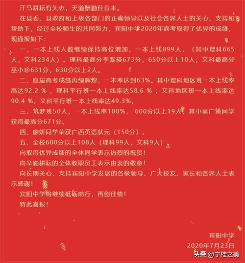 一直以来,宾阳中学都是顶呱呱的存在,曾经实力比肩市级中学南宁三中,曾流传着这样一句话“宾阳中学跺两脚全广西都怕”,可见宾阳中学的实力。