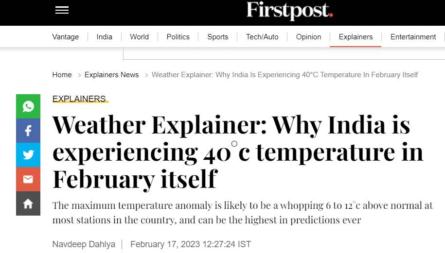 但是今年2月出现了,也是该次大陆有史以来最强、最早的高压发展。导致了下沉气流的不断增强,也引发了印度各地的最高气温异常上升。
